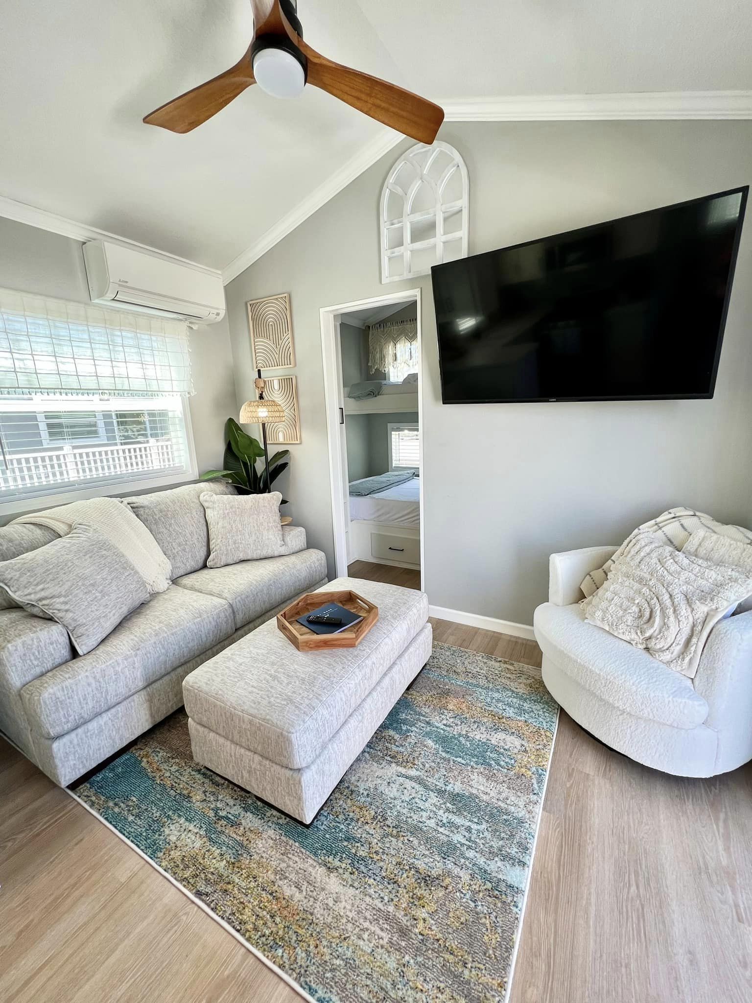 Welcome to the Barefoot Villa, a minimalist’s dream! This cozy retreat features 2 bedrooms with a queen bed, a bunk bed set, and a full-size sofa, perfect for a relaxing getaway. Enjoy the convenience of a fully equipped kitchen with a Keurig Duo Coffee Maker, dishes, basic cookware, and utensils. Step out onto your water-facing porch, fire up the charcoal BBQ grill, and gather around the propane fire pit for cozy evenings under the stars. With towels, linens, and pillows provided, all you need to bring is your favorite people! There’s parking for 2 vehicles, and the cabin comfortably sleeps 4. Book now for the ultimate getaway! Features: 2 bedrooms, 1 queen bed, 1 bunk bed set, 1 full size sofa, 1 bath with shower. Full kitchen includes Keurig Duo Coffee Maker, dishes, basic cookware and utensils. Towels, linens, and pillows included. Porch facing water. Charcoal BBQ grill, propane fire pit with seating, and picnic table. Parking for 2 vehicles. Sleeps 4.