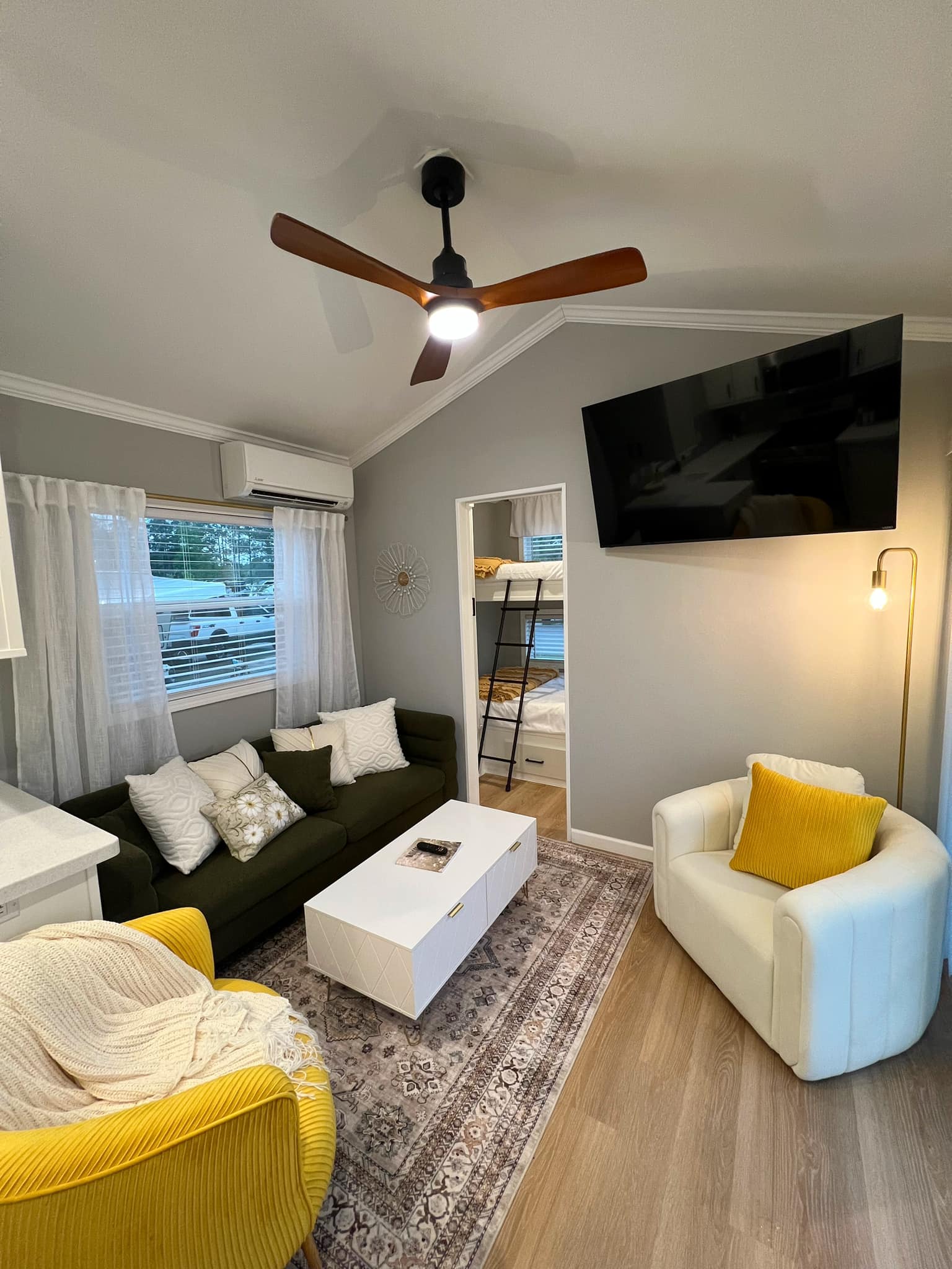 Relax and unwind at Lazy Daisy that sleeps 4. This delightful cabin offers a queen bed in the master bedroom and full-twin bunk beds, making it ideal for a family getaway. Spend your days exploring the great outdoors and your evenings around the firepit or enjoying a barbecue on the gas grill. Lazy Daisy is the perfect spot to create lasting memories. Features: 1 queen bed, 1 full-twin bunk bed, Firepit, Grill
