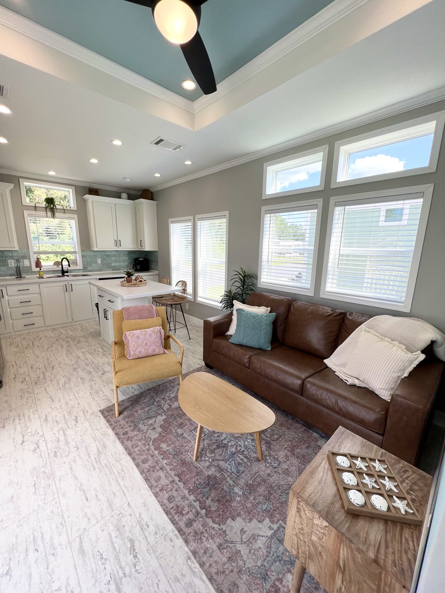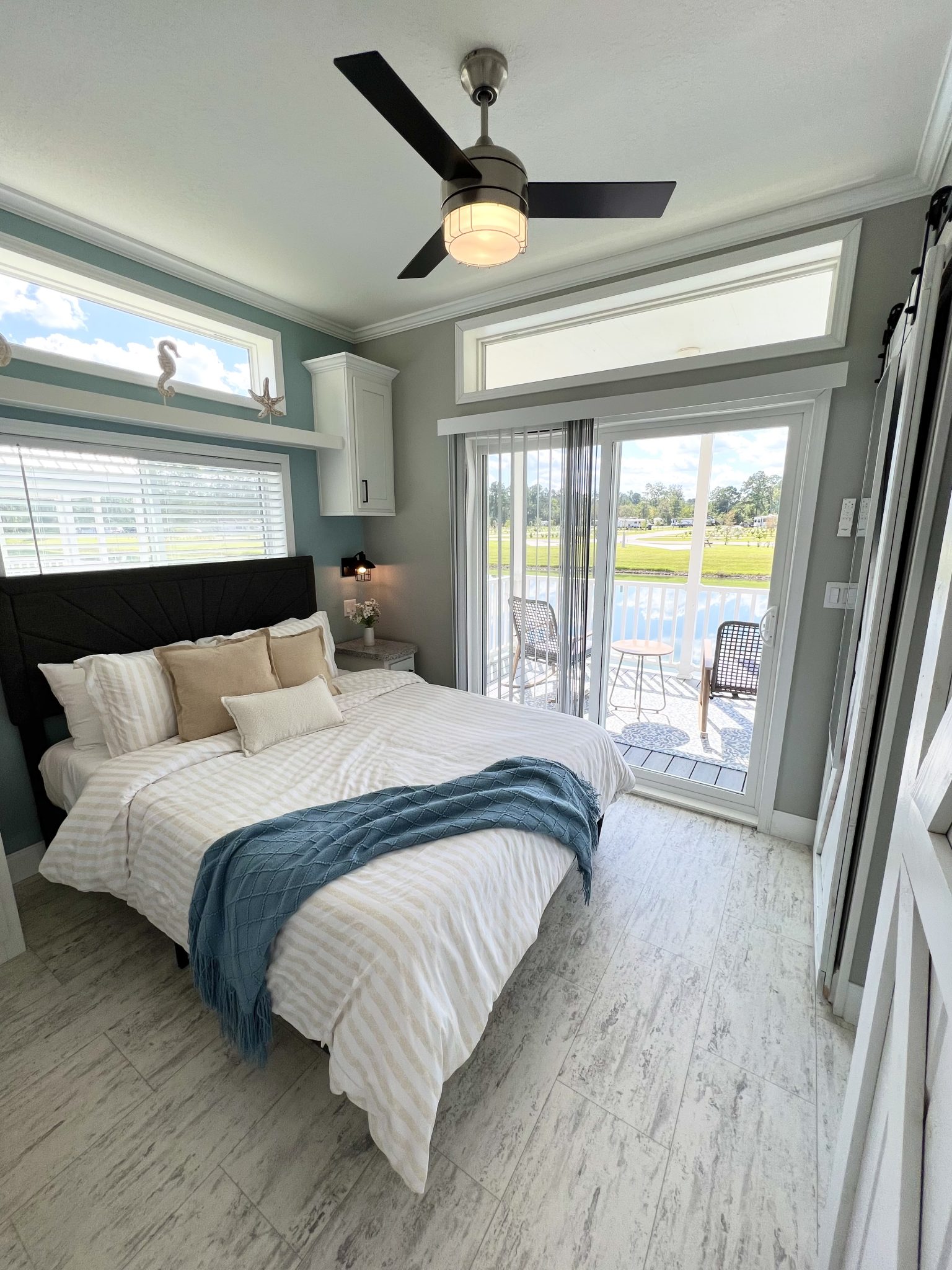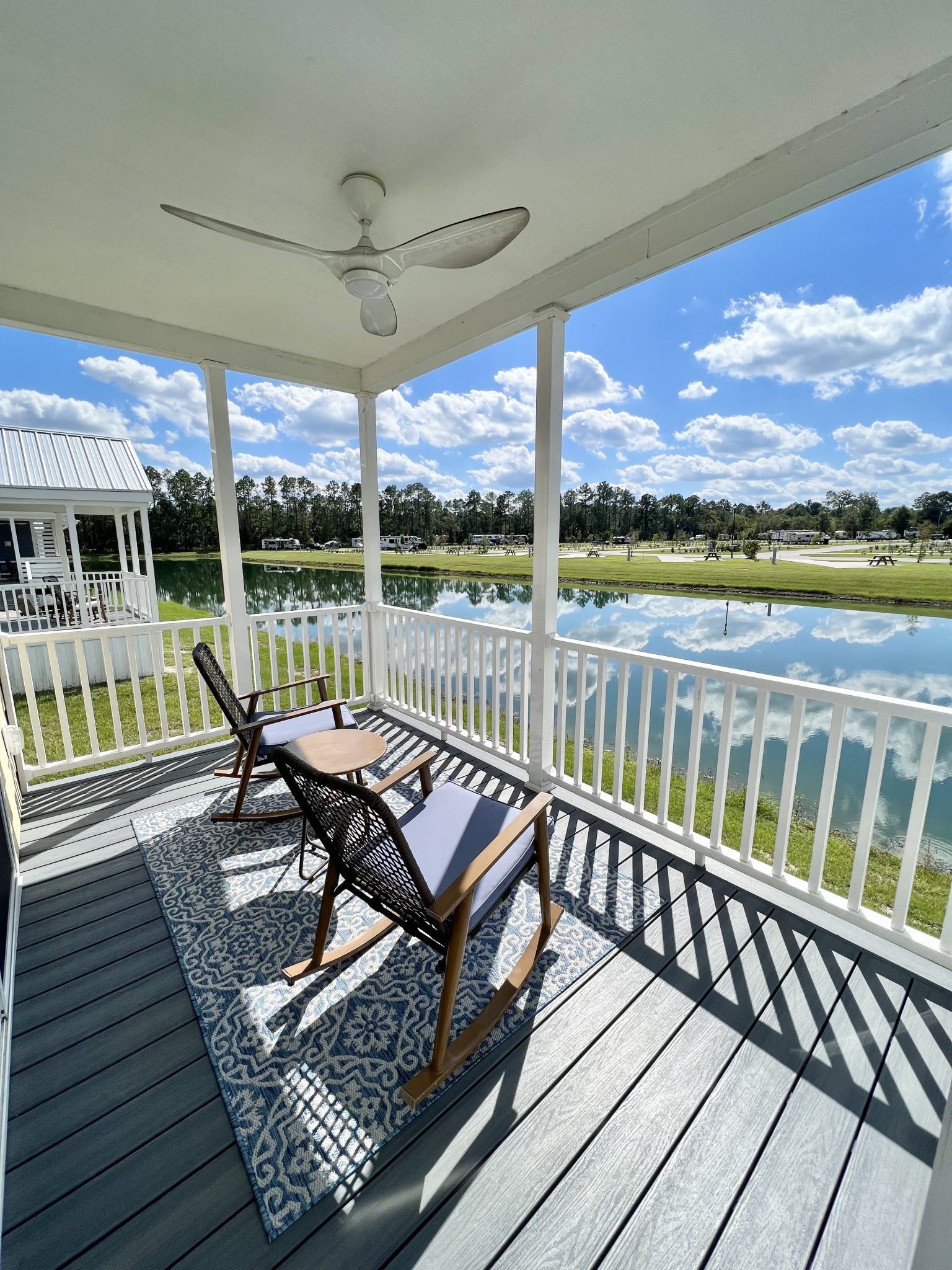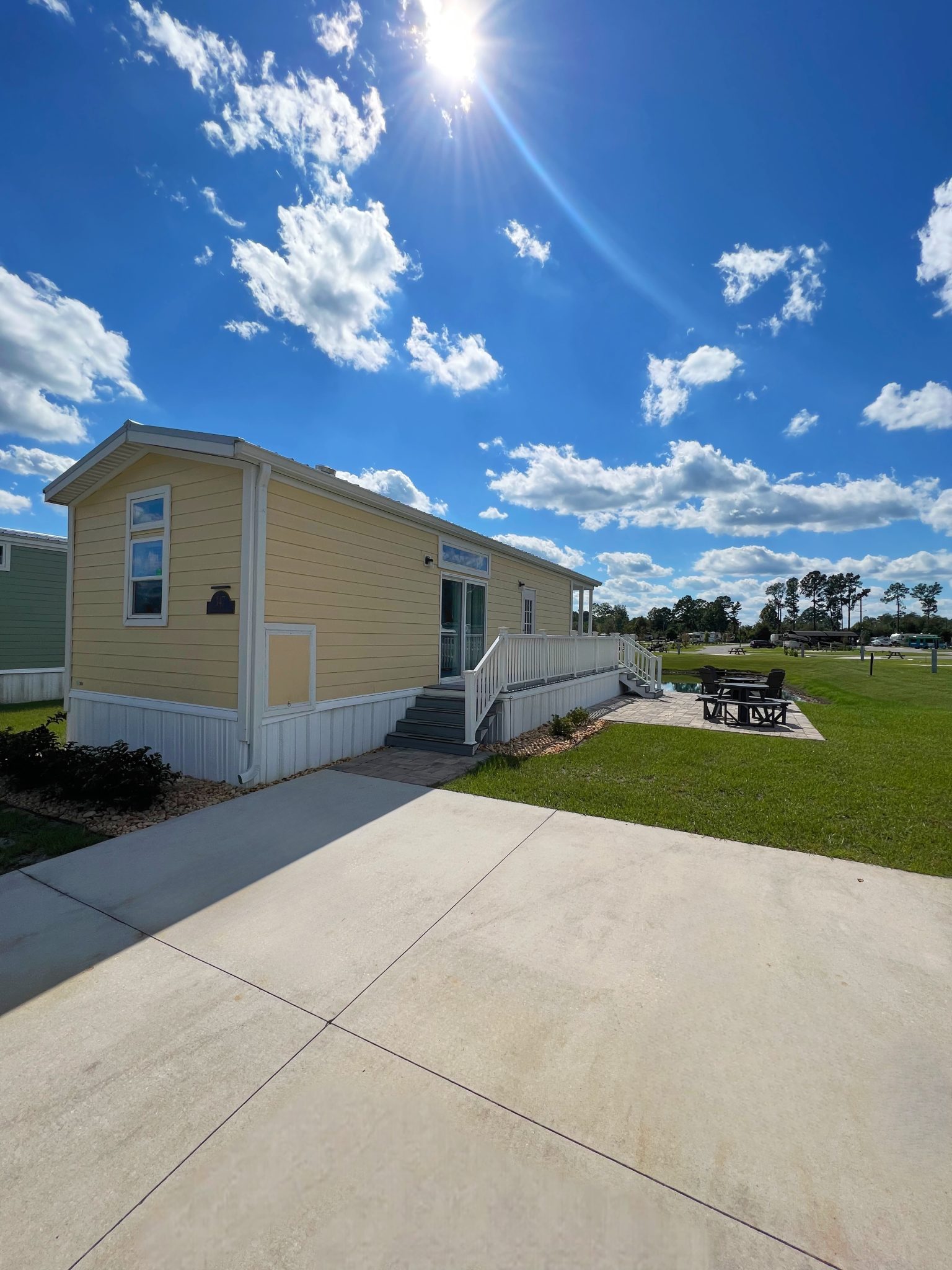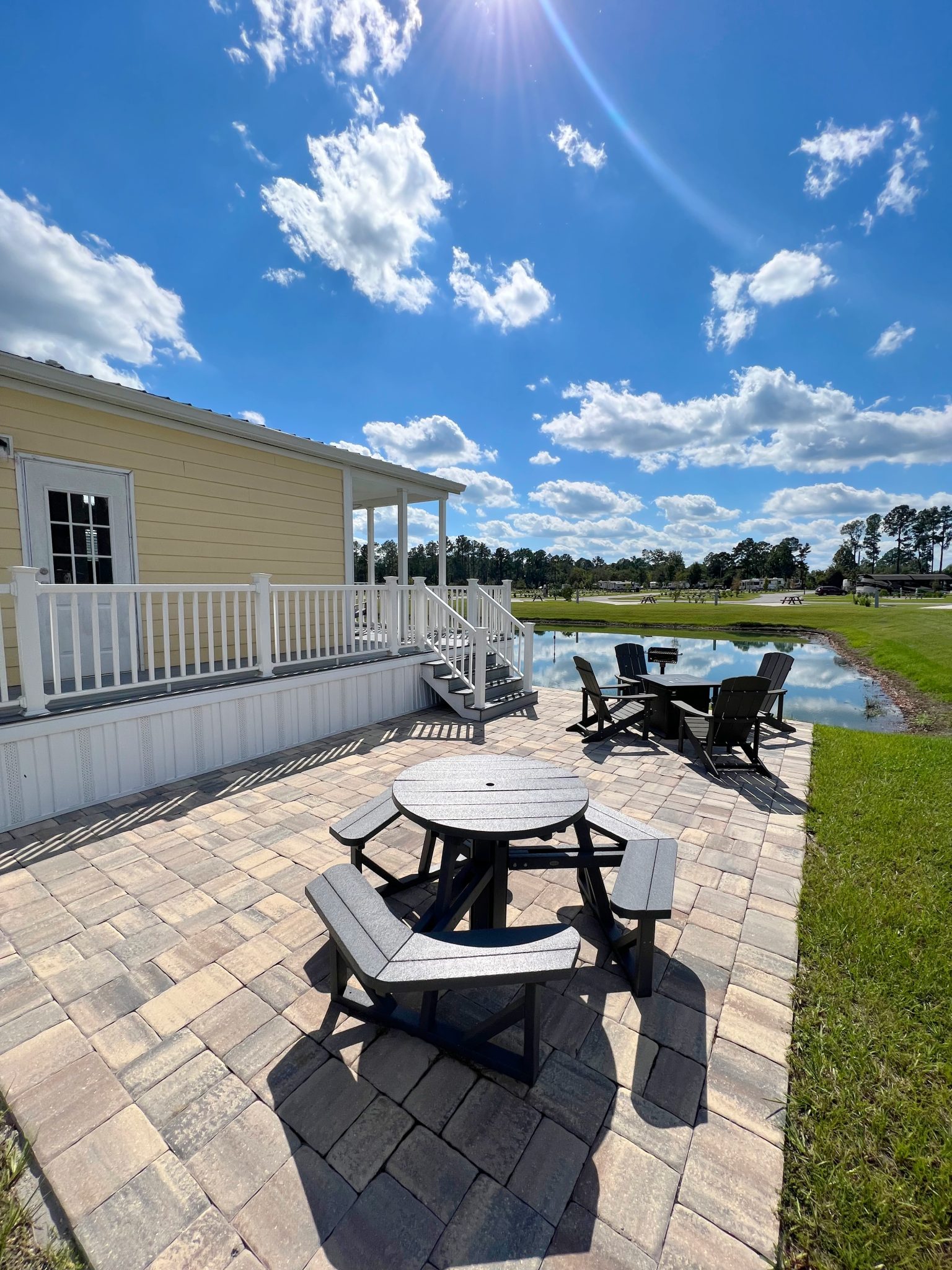 Get ready to soak up the sun at Cabin 347—your ultimate Sunshine State escape! Located in the heart of Florida, this cozy cabin is perfect for a dreamy getaway. You’ll love the cheerful yellow and blue furniture, a perfect blend of sun and water vibes! Relax in comfort with a queen bed and a full sleeper sofa, and whip up your favorite meals in the fully-equipped kitchen with a Keurig Duo Coffee Maker. The water facing porch is equipped with a seating area for your comfort. For your convenience, we have also included a charcoal BBQ grill and propane fire pit. We’ve got linens, towels, and pillows covered—just bring your sense of adventure! Book now and dive into your Sunshine State adventure! Features: 1 queen bed, 1 full sleeper sofa, 1 bath with shower. The full kitchen includes Keurig Duo Coffee Maker, dishes, basic cookware and utensils. Towels, linens, and pillows included. Porch facing water. Charcoal BBQ grill, propane fire pit with seating, and picnic table. Parking for 2 vehicles. Linen service not provided during stay. Sleeps 4 / $50 Pet Fee, Sleeps 4