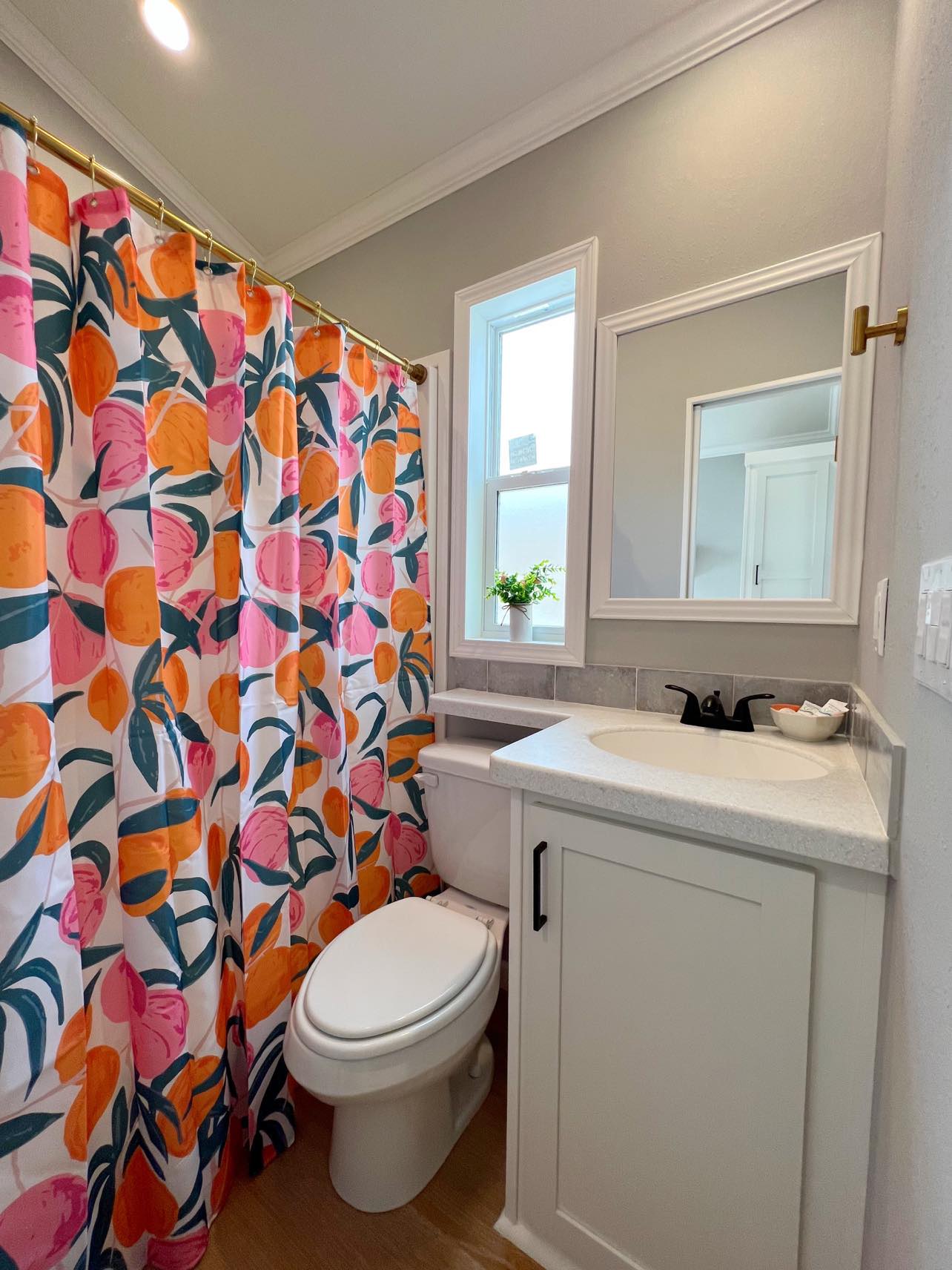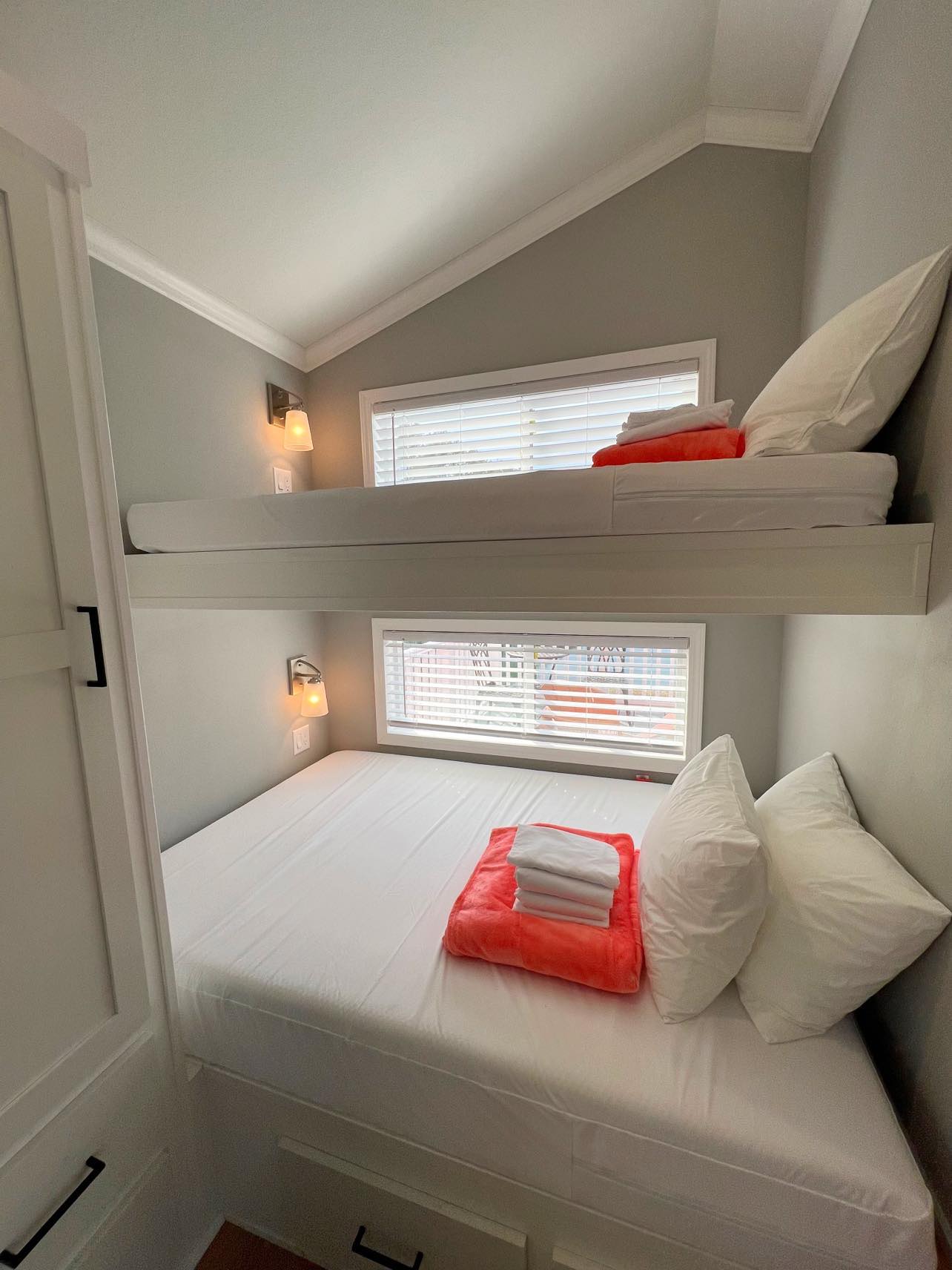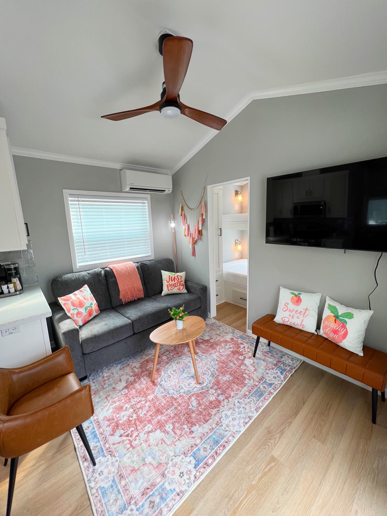 Welcome to Cabin 360, where everything is just peachy! This cabin’s theming and decor makes it perfect for a girls’ night or a family friendly getaway. This cabin features a queen bed, full size sofa, and twin bunk beds, plus 2 bathrooms with showers. There is plenty of room for everyone! The fully equipped kitchen, complete with a Keurig Duo Coffee Maker, makes meal prep a breeze. Relax on the small deck with bistro sets and umbrellas, fire up the charcoal BBQ grill, and enjoy a picnic. Towels, linens, and pillows are all provided! There is parking for 2 vehicles and a $50 pet fee. Cabin 360 sleeps 6 and is ready to host you for your next adventure! Features: 2 Bedrooms – 1 queen bed, 1 full sofa, 2 full beds (bunk beds), 2 separate bathrooms with shower. Full kitchen includes Keurig Duo Coffee Maker, dishes, basic cookware and utensils. Towels, linens, and pillows included. Small deck with 2 bistro sets & umbrellas. Charcoal BBQ grill and picnic table. Parking for 2 vehicles. Linen service not provided during stay. Sleeps 6 / $50 Pet Fee.